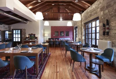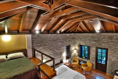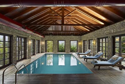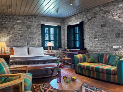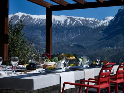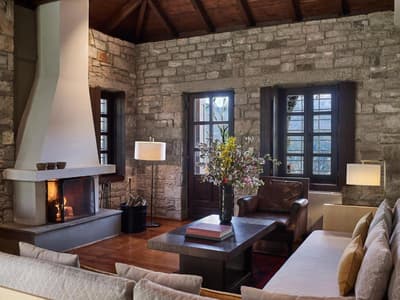 Difficile d’imaginer qu’au bout de ce petit chemin de pierre vous attend l’un des plus fabuleux complexes hôteliers du Nord de la Grèce. Au sommet du village du même nom, l’Aristi Mountain Resort and Villas jouit d’une situation exceptionnelle en bordure du parc national de Vikos-Aoös, et offre des vues époustouflantes sur les montagnes environnantes. Maintenant, fermez les yeux, écoutez la nature et respirez… Ce n’est plus un bol, c’est un vrai shoot d’air pur que vous allez prendre ici. Alors autant dire qu’après une journée passée à explorer la région, vous allez surkiffer les aménagements de l’hôtel, à commencer par le spa et sa belle piscine couverte d’où vous pourrez admirer le paysage. A moins de préférer vous installer tranquille au salon pour boire un verre et jouer aux échecs, ou encore retourner prendre l’air sur un transat en terrasse, tandis que l’un des chats de la maison viendra se blottir contre vous ; on n’est pas bien là ? Et pour avoir une idée de ce que peut être la gastronomie locale, direction le restaurant Salvia où vous dégusterez des plats tous plus excitants les uns que les autres, avant de rejoindre votre nid douillet où vous attend carrément le petit feu de cheminée qui va bien ; c’est presque aussi sauvage mais quand même vachement plus confort qu’un bivouac !