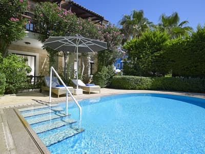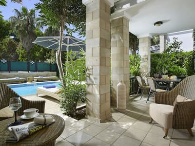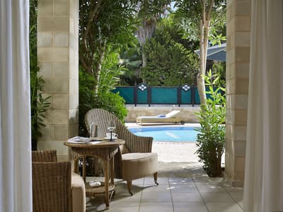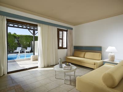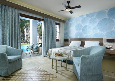 Agréable et encore plus confortable, elle baigne dans une atmosphère reposante et sereine. Sa terrasse est aménagée de belles chaises pour apprécier la vue sur la piscine. Elle accommode un très grand lit et dispose d’un canapé dans un coin de la pièce. Salle de bain avec baignoire ou douche à effet de pluie.
