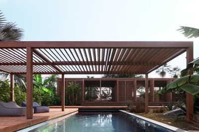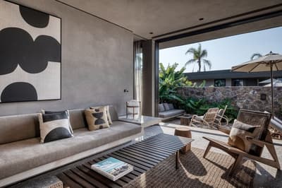 La décoration est plutôt charmante et contemporaine avec un mobilier en bois, des objets de décoration artisanaux et se complète dans des tons gris. La chambre est dotée d’un lit king-size et d’un canapé-lit pour plus de confortabilité. La salle de bains est équipée d’une douche. Ambiance tropicale !