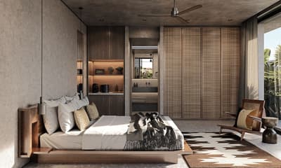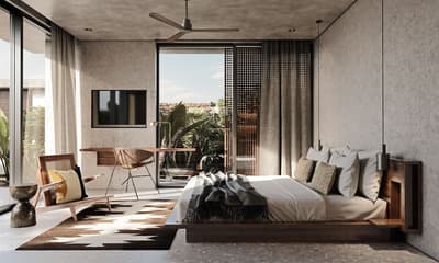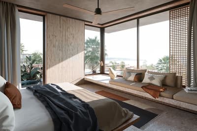 La décoration est plutôt charmante et contemporaine avec un mobilier en bois, des objets de décoration artisanaux et se complète dans des tons gris. La chambre est dotée d’un lit king-size et la salle de bains est équipée d’une douche. Ambiance tropicale !