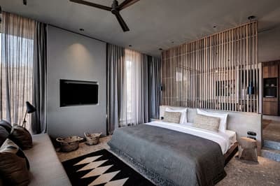 La décoration est plutôt charmante et contemporaine avec un mobilier en bois, des objets de décoration artisanaux et se complète dans des tons gris. La chambre est dotée d’un lit king size et la salle de bains est équipée d’une douche. Ambiance tropicale !