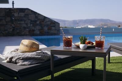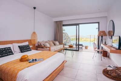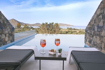 Situé sur une colline, l'Elounda Palm Hotel Suites domine la sublime baie de Mirabello et l'îlot de Spinalonga. Palmiers, ficus, pins et bougainvilliers roses magnifient les différents espaces, délimités par des murets en pierre locale. A l'ombre de leurs feuillages généreux ainsi que de pergolas, on se prélasse, on déjeune en terrasse au bord de la piscine. Fish and chips de calamars, mezze, grillades et salade grecque : on se régale entre des longueurs dans la piscine d'eau de mer, une matinée à la plage ou encore une virée shopping à Plaka. Ceux qui auront la chance d'avoir une piscine privée, qui plus est avec vue, ne voudront plus quitter leur cocon ! La plage en contrebas fait partie d'une longue série de plages de sable fin qui longent le golfe. Pensez à vous lever tôt pour profiter d'une séance de yoga au lever de soleil ! Une chose est sûre, ce resort rime avec convivialité...