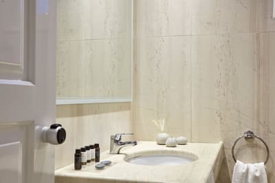 Décorée dans des tons ocres, elle bénéficie d’un design moderne avec un mobilier en bois clair et des luminaires qui contribuent à une ambiance de détente. La chambre peut être configurée, au choix, avec un lit queen size (2,00 x 1,60) ou des lits jumeaux (1,00 x 2,00) et la salle de bains en marbre est équipée d’une cabine de douche. Ambiance de détente !