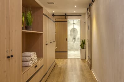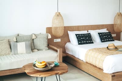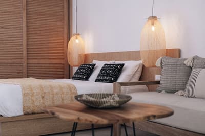 Décorée dans des tons neutres et doux, elle bénéficie d’un design moderne avec un mobilier en bois clair et des luminaires qui contribuent à une ambiance de détente. Pour vos soirées festives; un salon séparé avec canapé. La chambre dispose d'un confortable lit double et la salle de bains en marbre est équipée d’une douche à l'italienne et d’une baignoire. Ambiance de détente !