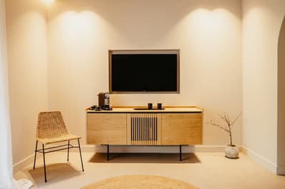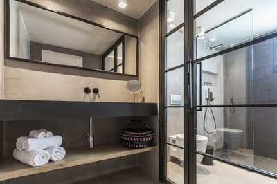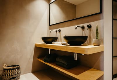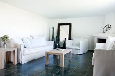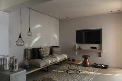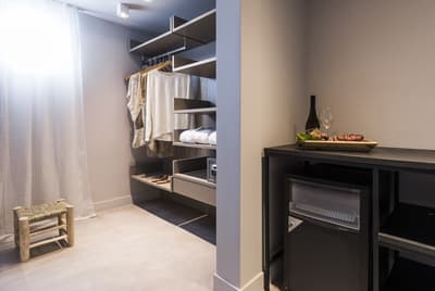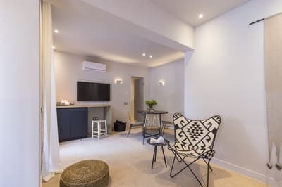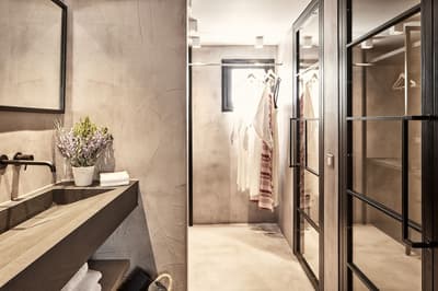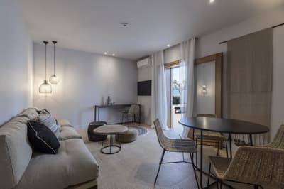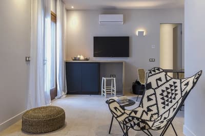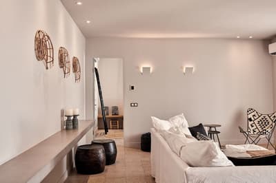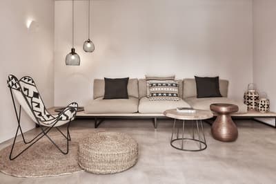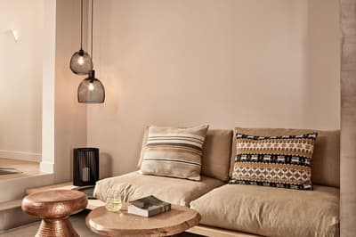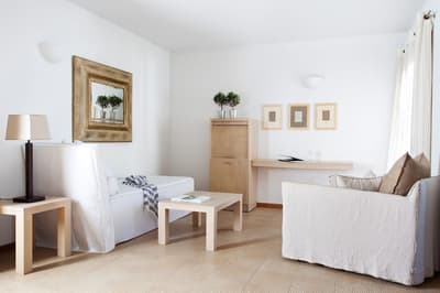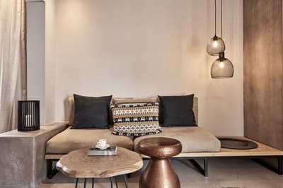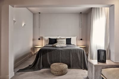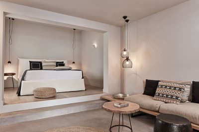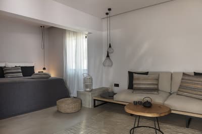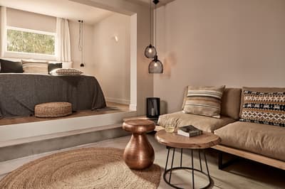 L’ensemble est dans un style de décoration contemporaine avec une palette de couleurs neutres et minimalistes, des éléments de design crétois faits main et de meubles faits sur mesure par des artisans locaux. La chambre double comprend un espace de vie séparé avec deux canapés et un coin dressing et est dotée d’un lit king. La salle de bains minimaliste est ornée de carreaux de mosaïque de couleur terre avec une baignoire autoportante. Le tout dans une atmosphère conviviale !