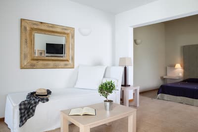 L’ensemble est dans un style de décoration contemporaine avec une palette de couleurs douces, des éléments de design crétois faits main et une literie de la marque grecque durable Adorno. La chambre est dotée d’un lit double ou de lits jumeaux et d'un coin salon avec un canapé-lit simple pour plus de confortabilité. La salle de bains en mosaïque de couleur terre est équipée d'une baignoire surdimensionnée. Le tout dans une atmosphère conviviale !