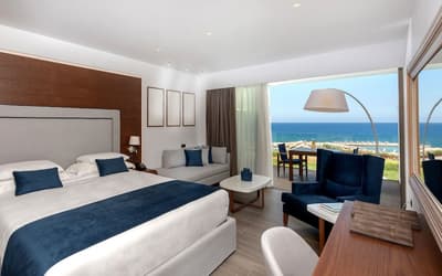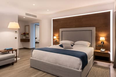 Dans la riche offre hôtelière crétoise, Le Nana Princess ajoute une dimension supplémentaire, l’expérience 5 étoiles suprême. Vous voulez du luxe, un cadre exclusif, une intimité absolue ? Bienvenue dans un univers très au-dessus des standards locaux. Vous êtes loin du petit hôtel de charme. Au premier coup d’œil, vous serez littéralement soufflé par l’architecture. De grands bâtiments qui se dressent fièrement devant l’immensité de la mer. Un mélange impressionnant de design moderne et de matériaux nobles. Murs en pierres de taille, colonnes en marbre, œuvres d’art habilement disposées, immenses baies vitrées qui surplombent la baie. Vous sentez ce parfum ? Les odeurs d’herbes sauvages et de fleurs locales flottent au-dessus du parc. Les distances peuvent être assez grandes mais votre chauffeur est déjà prêt pour vous conduire à votre chambre. Si vous aimez la domotique et les gadgets électroniques, vous allez être gâté : luminaires intelligents, rideaux électriques, télévision grand écran connectée, contrôle individuel de la température de votre piscine… Avec tout cela, vous en oublieriez presque de tester le Royal Wellness Club de l’hôtel. Ce serait dommage car les installations santé et bien-être sont clairement l’un des atouts majeurs de ce petit paradis ! Un peu de renforcement musculaire avant vous plonger dans la piscine intérieure éclairée aux ultraviolets ? Ça doit être ça, le bonheur…