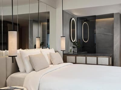 L’ensemble est plutôt dans un style de décoration élégante et moderne avec un mobilier haut de gamme, des luminaires design et se complète dans des tons neutres. La chambre est dotée d’un lit double (King ou Queen size) et lits jumeaux sur demande. La salle de bains spacieuse en marbre est bien équipée d'une douche ouverte. Le tout dans une ambiance cosy !