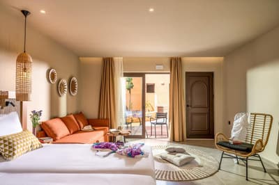 Que dire si ce n'est que vous serez totalement sous le charme de cet hôtel pas comme les autres ! Certes, vous n'êtes pas en bord de plage, mais vous verrez la mer depuis votre terrasse, et les plages sont à 1,5 km. L'idée, ici, c'était plutôt de créer un lieu différent, au cœur d'un village pittoresque, proche des curiosités naturelles et culturelles qu'offre la côté nord de la Crète. Ce lieu revisite l'architecture cubique des îles grecques pour leur donner une touche plus contemporaine, mais tout en respectant les codes traditionnels, avec cette pierre locale et l'abondance de pergolas en bois dont raffolent les bougainvilliers ! Les piscines sont soit design, soit paysagées. Toutes sont splendides, y compris les piscines partagées ! Et ces daybeds en surplomb de l'eau, entourés d'oliviers, seront vos perchoirs de prédilection ! Les chambres ont pour le coup cette empreinte illienne très forte, avec ces matières et imprimés typiques et ces objets artisanaux qui viennent parfaire ces univers emplis de douceur, de couleur sable. On adore le retaurant et les bars, des espaces aussi beaux et glamour que tradis. En plus, le Pyria Hotel Adults Only 14+ est vertueux, chouchoutant ses jardins de plantes endémiques, utilisant l'énergie solaire et faisant des dons à des œuvres caritatives.