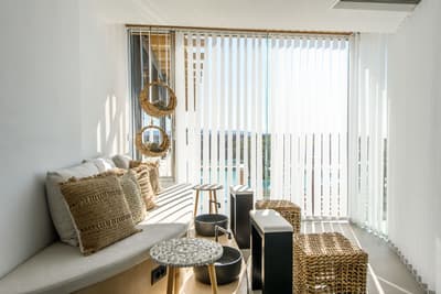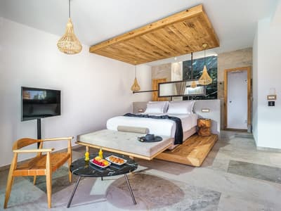 La décoration est plutôt chic et élégant avec un carrelage effet parquet, un mobilier en bois assorti et des luminaires design. La chambre est dotée d’un lit de jour, d’un lit queen confortable et la salle de bains ouverte est équipée d'une douche à l'italienne et de doubles lavabos. Ambiance tropicale !