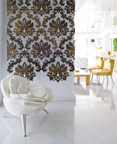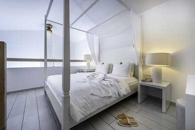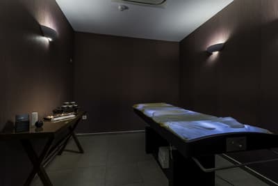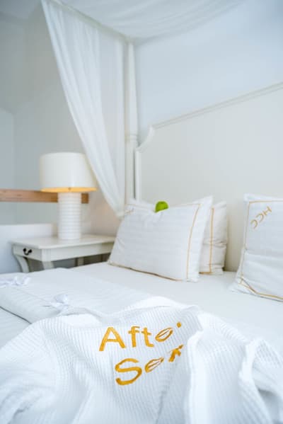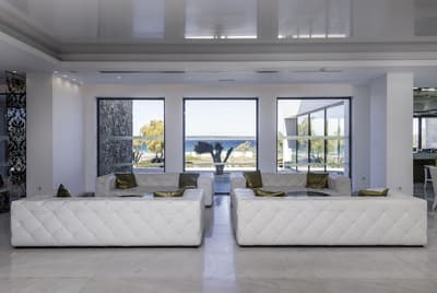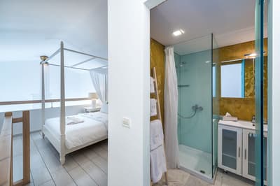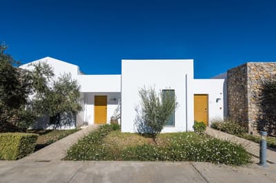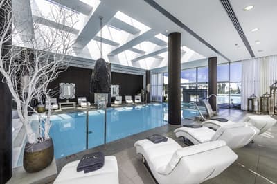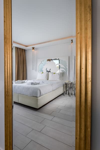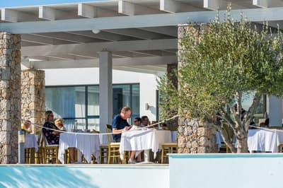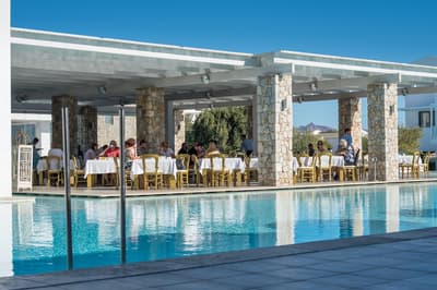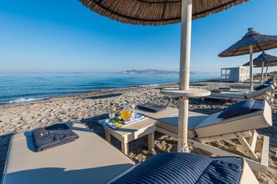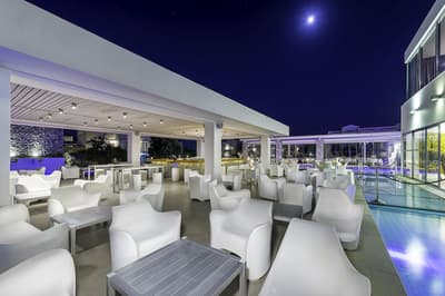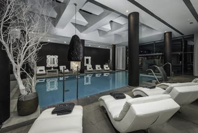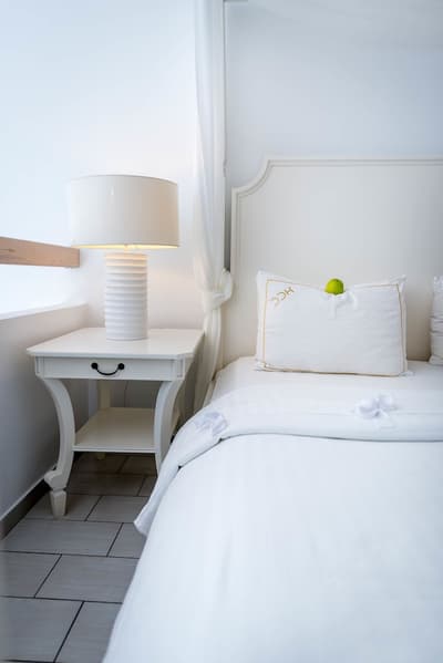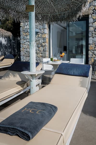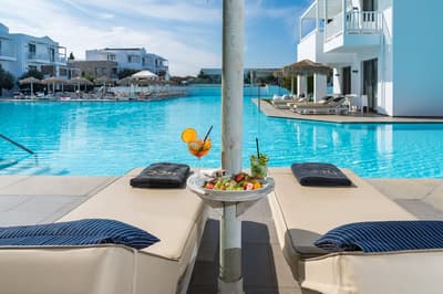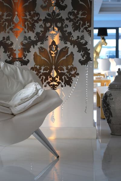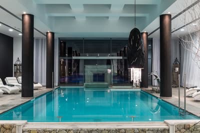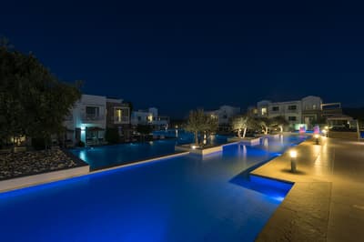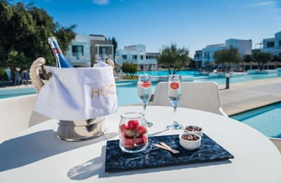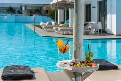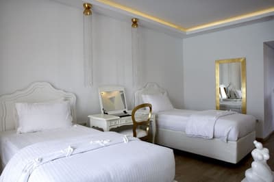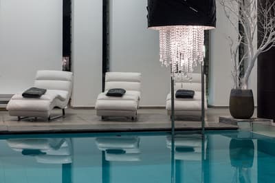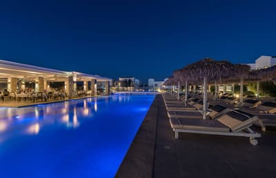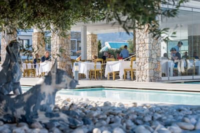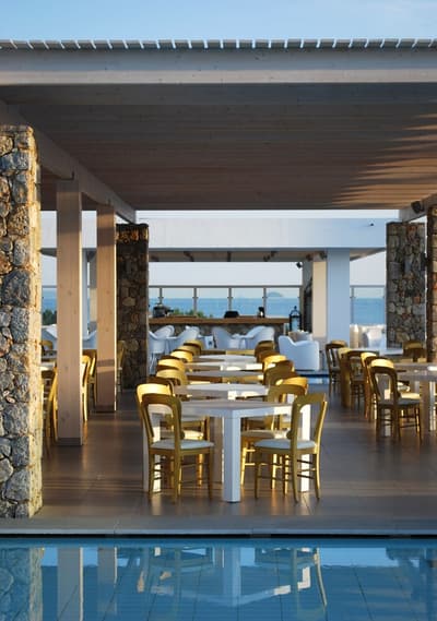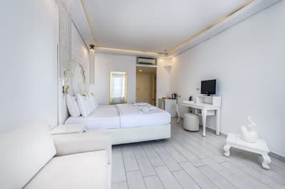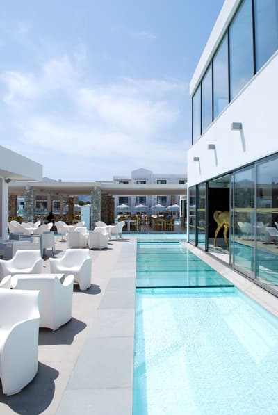 Glamour est sans doute l'adjectif qui qualifie le mieux ce resort sensoriel dédié au bien-être… Le design tantôt baroque tantôt contemporain transcende l'esthétique traditionnelle de ces constructions blanchies à la chaux. Des volumes simples mixent ici pierres apparentes et baies vitrées, organisés autour d'une vaste piscine scénographiée, où des fontaines jaillissent sous des lumières colorées en soirée. Des chaises longues campent sur des pontons qui avancent dans le bassin. Aux angles, des coins de pelouse accueillent des fauteuils en résine blanche de designers. Oliviers et parasols en feuilles de palme dépaysent. Inattendue, cette magnifique chapelle dédiée aux cérémonies de mariage. Dans les intérieurs, une lumière abondante sublime les sofas capitonnés tout blancs, ces chevaux dorés, emblèmes de l'hôtel, et les plafonds à miroirs. Un mur végétalisé apporte la touche de vert et une sculpture de femme, la touche de rouge. Pour plus de couleurs encore, le soleil couchant s'occupe de tout...
