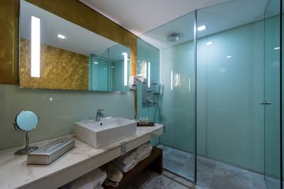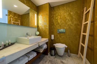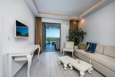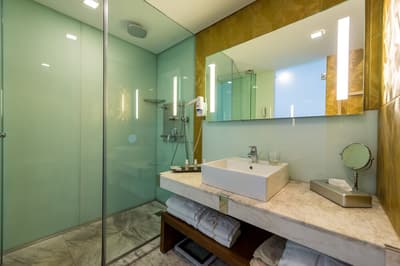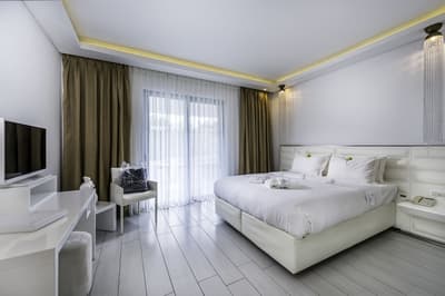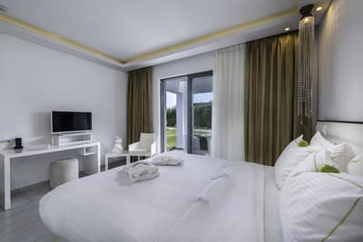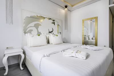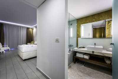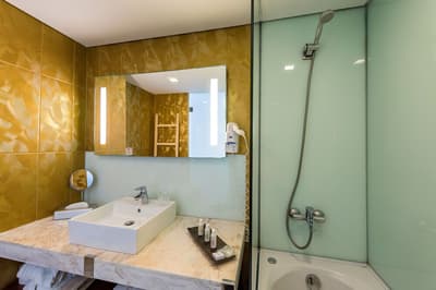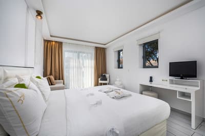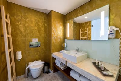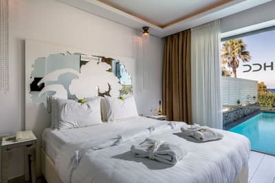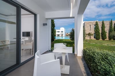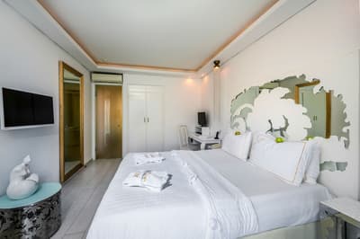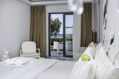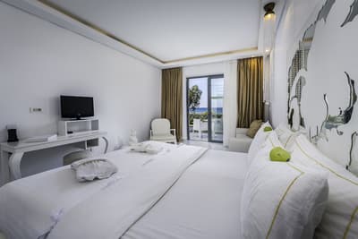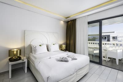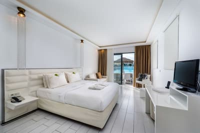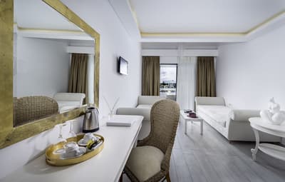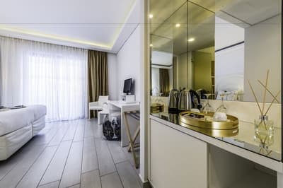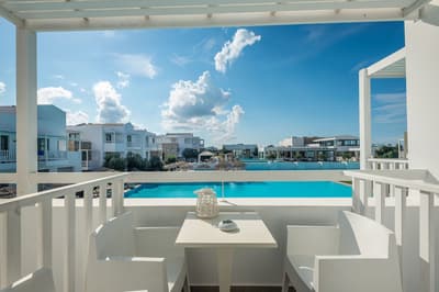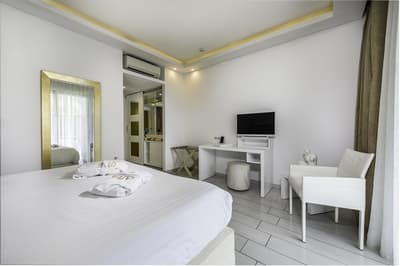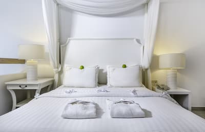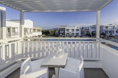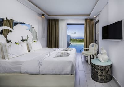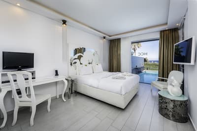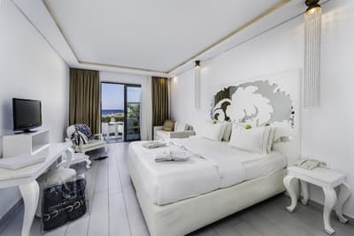 Elle a tout le nécessaire pour un séjour confortable et agréable. Son balcon est aménagé de belles chaises et profite d’une vue sur la mer ou la piscine. Elle accommode un grand lit et dispose d’un beau fauteuil dans un coin de la pièce. Salle de bain chic avec douche ou baignoire d'hydromassage.