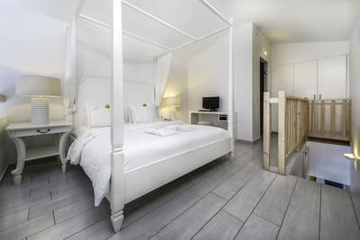 Plus spacieuse, elle procure encore plus de confort. Installée au calme, c’est un petit havre de paix. Son balcon est aménagé de belles chaises et profite d’une vue sur la mer ou la piscine. Elle accommode un grand lit et dispose d’un beau fauteuil dans un coin de la pièce. Salle de bain chic avec douche ou baignoire d'hydromassage.