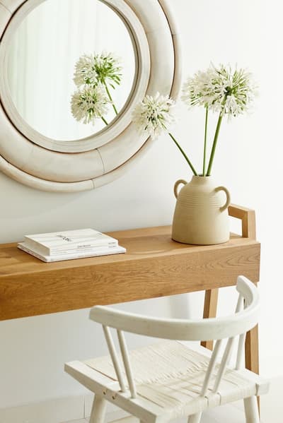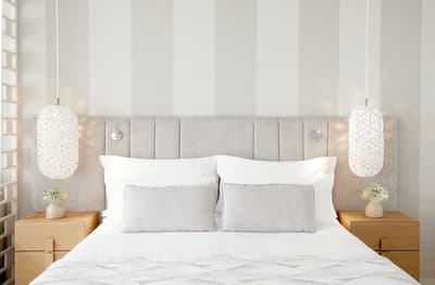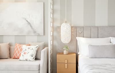 Simple et vraiment cosy, l’ensemble est très léger. Peinte de blanc, elle est résolument design. La baie vitrée laisse pénétrer la lumière naturelle pour la rendre lumineuse et accueillante. Les meubles en bois ajoutent de l’exotisme à la pièce. Bercer de couleurs pastel, elle est réellement harmonieuse.