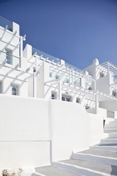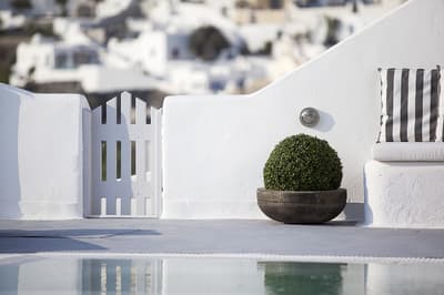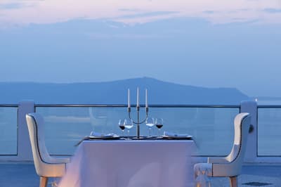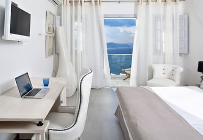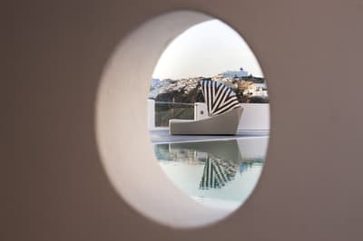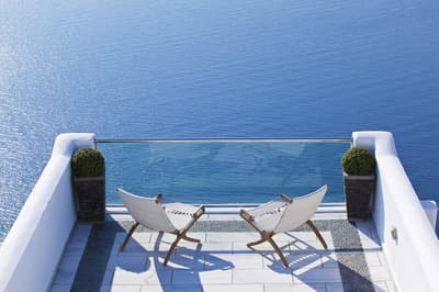 Autant vous prévenir : mieux vaut ne pas avoir le vertige pour séjourner au Belvedere Suites, car il s’agit d’un hôtel qui porte vraiment bien son nom. Situé sur les falaises de la Caldera dans le village de Firostefani, l’établissement est celui qui offre certainement l’une des vues les plus impressionnantes sur la mer Egée. La trentaine de chambres de l’établissement est répartie sur plusieurs niveaux, reliés entre eux par un labyrinthe de marches et des couloirs couverts qui donnent l’impression d’être dans une grotte. Mais le clou du spectacle se situe au niveau de la piscine, où vous pourrez carrément nager au-dessus de la mer ; tout simplement renversant. Côté chambre, surtout pensez bien à demander une vue mer, parce que ce serait dommage de venir au Belvédère Suites sans pouvoir complètement profiter de la beauté du lieu. Attention, il n’y a pas de restaurant dans l’hôtel, mais Fira est accessible à pied, et au pire, certaines chambres disposent d’un coin kitchenette. Un dernier conseil pour la route : faites appel au room service pour dîner tranquillement sur votre terrasse au coucher du soleil. Un moment que vous n’êtes pas prêts d’oublier, et qui va faire exploser les likes de votre compte Instagram !
