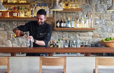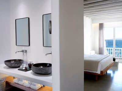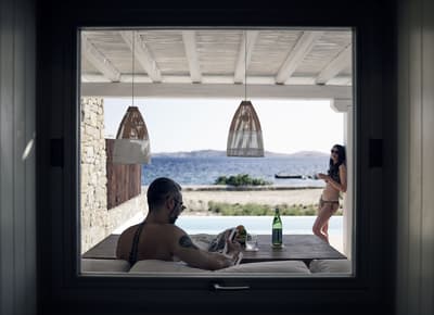 Vous voulez savourer Mykonos loin des Beach clubs et des milliers de teufeurs ? On a la solution ! Le Bill and Coo Coast Suites est un peu le secret le mieux gardé de cette île chaleureuse et colorée. Imaginez un peu une oasis romantique posée sur le bord de la plage d’Agios Ioannis, réservée à une poignée de clients. Adults only, bien sûr ! Il ne manque plus que vous et votre bae sur cette incroyable terrasse face à la mer Egée. Lignes pures, marbre et pierre de taille, coussins cosy. Allongez-vous sur les transats en bois posés juste au-dessus de la piscine extérieure. Devant vous, la plage et l’infini bleuté à perte de vue. De quoi vous sentir léviter. Les suites jouent sur une gamme de couleurs douces, agrémentées de touches sophistiquées. A l’intérieur, le blanc et le bois clair reposent les yeux. Une mine de petits détails font toute la différence : sacs de plage et chapeaux de soleil à disposition, produits Molton Brown dans la salle de bains... Sur la terrasse privée, le décor se fait plus minéral autour de votre jacuzzi ou de votre piscine. Un design minimaliste parfait pour détendre l’esprit. Attention, le corps n’est pas en reste. Vous aimez la viande ? Direction sur le Beef Bar sur la plage pour un gyros de bœuf de Kobé les pieds dans le sable, sous le ciel étoilé. Vous voulez tester le Mykonos qui chante et qui pétille ? N’oubliez pas le portable prêté par la réception. Une seule touche et votre carrosse viendra vous chercher à n’importe quelle heure. Mieux que Cendrillon…