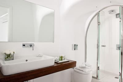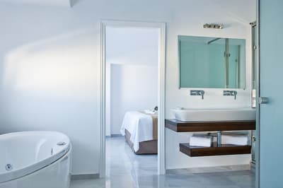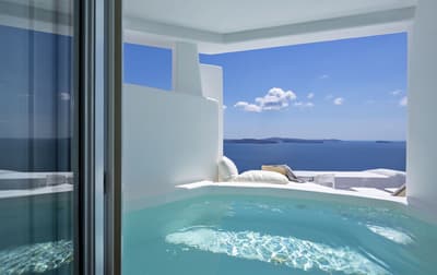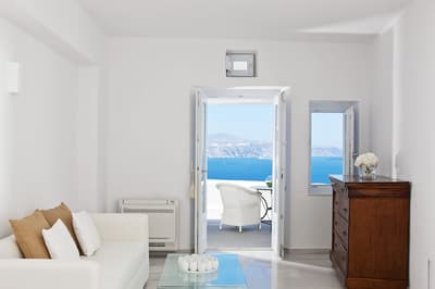 Très spacieuse, la terrasse est aménagée d’un jacuzzi et de belles chaises pour apprécier le cadre merveilleux. Elle profite d’une vue époustouflante sur la Caldéra et les couchers de soleil. C’est l’idéal pour un séjour idyllique. Le salon est aménagé de canapés et de fauteuils confortables. Salle de bain avec baignoire ou douche à effet de pluie.