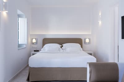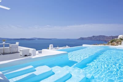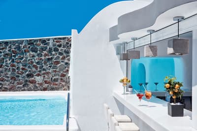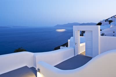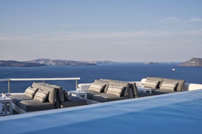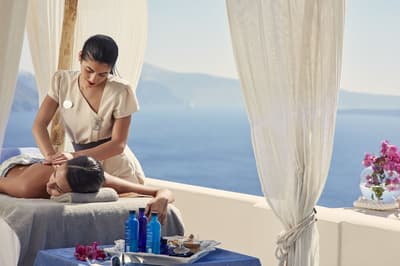 Transformer d’anciennes grottes en suites luxueuses, tel est le challenge qu’ont parfaitement réussi les propriétaires de cet établissement. Une réussite couronnée d’une pluie de récompenses qui le classe régulièrement parmi les meilleurs hôtels de luxe. Vous n’en croirez pas vos yeux ! Les cavités rocheuses autrefois utilisées pour stocker le vin sont devenus des espaces de zénitude et de ravissement absolus. Difficile de réaliser que vous êtes au centre-ville d’Oia. Une fois la porte passée, vous entrez dans un havre de paix face à la mer. L’effet wahou fonctionne au premier coup d’œil ! Un ensemble d’un blanc immaculé, typique de l’architecture de l’île, accroché à flanc de falaise au-dessus de la Caldeira. Un entrelac de petites terrasses ornées de bougainvilliers et d’allées qui serpentent sous des arches de pierre. Un labyrinthe d’une blancheur éclatante qui vous réserve des surprises à chaque tournant. Ça et là, des portes qui mènent vers l’intimité des chambres, toutes différentes. Les plafonds voûtés donnent une atmosphère très particulière. Vous êtes du genre minimaliste ? Vous adorerez la déco particulièrement épurée, agrémentée de quelques rares pièces de mobilier traditionnel en bois. Vous risquez surtout de passer beaucoup de temps allongé sur votre balcon privé, avec vue imprenable sur la mer Egée. Il y a mille et une choses à voir à Santorin mais ce sera pour tout à l’heure. Pour l’instant, vous êtes attendu sur la jolie terrasse pour une séance de yoga. Inspirez. Soufflez…