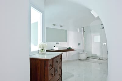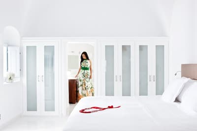 C’est une parfaite balance d’élégance dans une architecture traditionnelle grecque. Peinte de blanc, elle est très design. Elle laisse pénétrer la lumière naturelle pour une pièce lumineuse et accueillante. Le mélange de bois et de rotin crée une décoration harmonieuse et exotique.