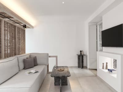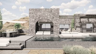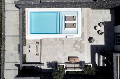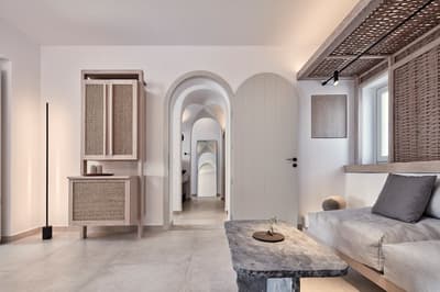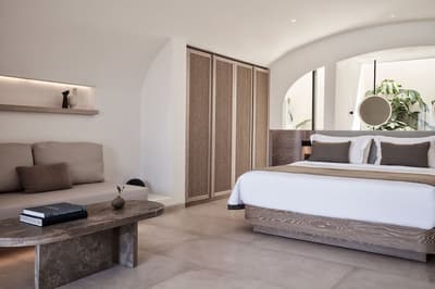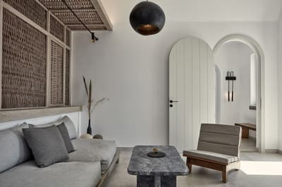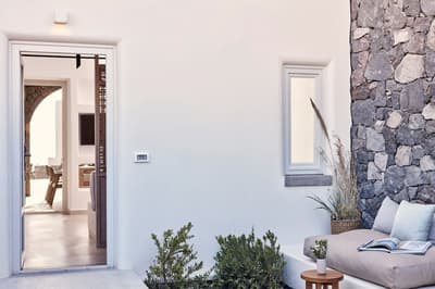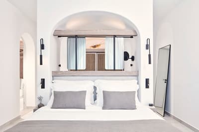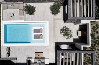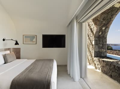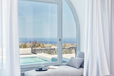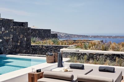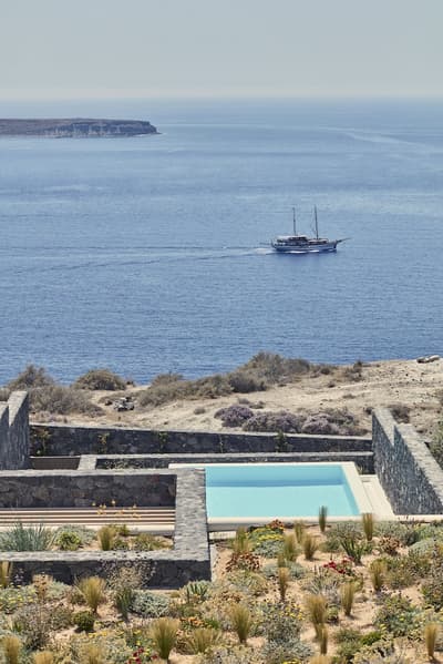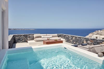 Des suites et des villas toutes dotées de piscine, cet hôtel est un rêve éveillé face à la mer Egée, nappé d’une jolie pierre volcanique.