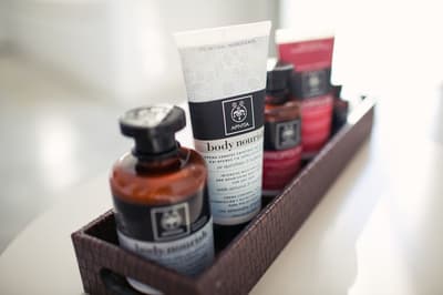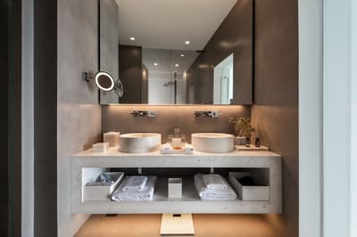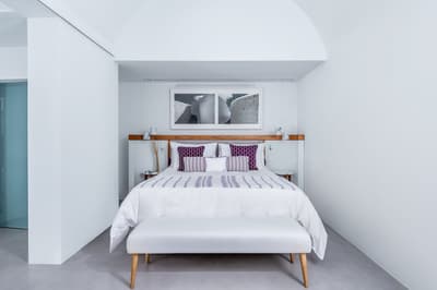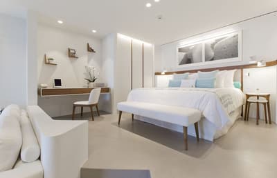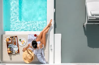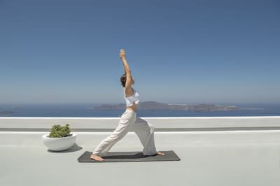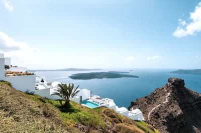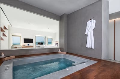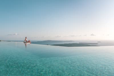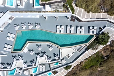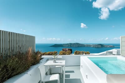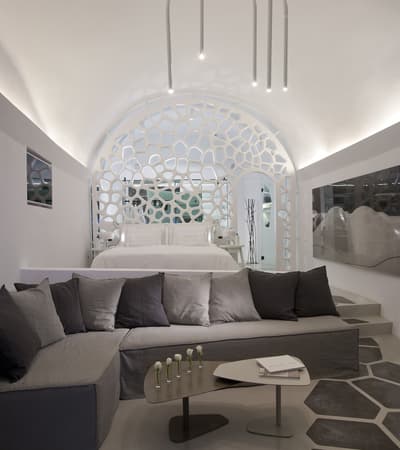 Un boutique hôtel touché par la grâce ? En tout cas, un sanctuaire de calme et de volupté perché au-dessus de la mer Egée. A l’extérieur, un vrai décor de carte postale. Bâtiments blanchis à la chaux accrochés en escalier à la falaise d’Imerovigli. Au loin, les églises au dôme bleu cobalt et les plages de sable noir emblématiques de Santorin. Devant vos yeux, la fameuse baie de la Caldeira. Attention : l’hôtel est véritablement à flanc de colline. La bonne nouvelle, c’est qu’avec les nombreuses marches, vous n’aurez pas besoin de tester la salle de fitness. C’est parti pour la visite ! Le minimalisme de la déco extérieure est profondément apaisant. D’en haut, le bleu turquoise des piscines et des jacuzzis privés prend des airs de pierres précieuses serties dans un univers de blanc et de gris. Dans votre chambre, le même style épuré mais en version raffinée. Meubles design, matériaux écologiques, légères touches de couleur, produits cosmétiques de luxe. Avant de vous installer pour admirer la vue de votre terrasse privée, prenez le temps de choisir votre oreiller parmi les six qui vous sont proposés. Tout ici invite au repos et à la contemplation. Vous voulez une autre recette vers la sérénité ? Essayez un cocktail signature en fin de journée sur la terrasse du Champagne Lounge, quand les eaux bleues de la mer Egée deviennent dorées. Vous allez voir, ça marche à tous les coups !