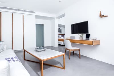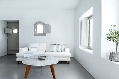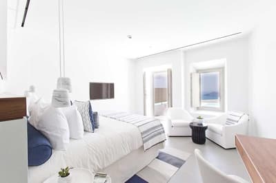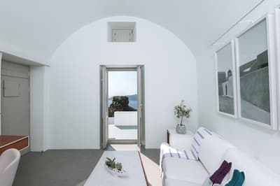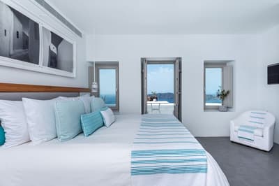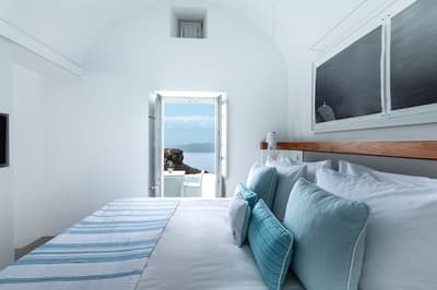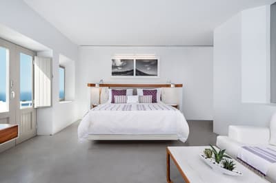 Idéale pour les couples, elle baigne dans une atmosphère romantique et sereine. La grande terrasse dispose d'aménagements pour profiter de la vue panoramique sur la Caldéra. Elle dispose d’un très grand lit et d’un petit bureau dans un coin de la chambre. Salle de bain avec 2 vasques et une douche à effet de pluie.