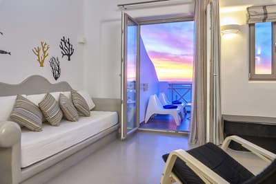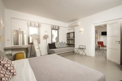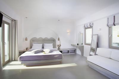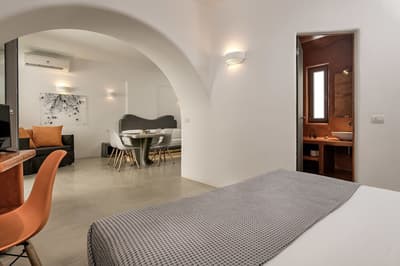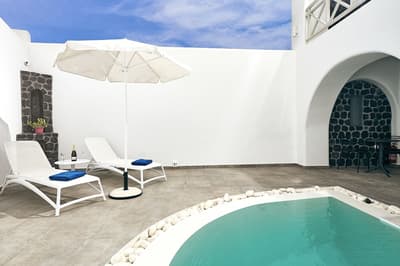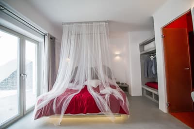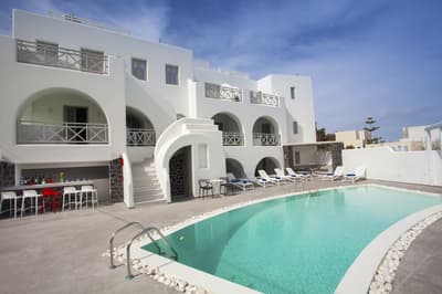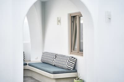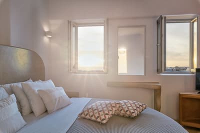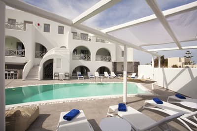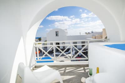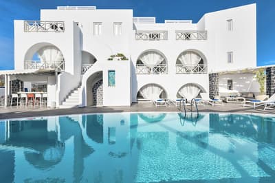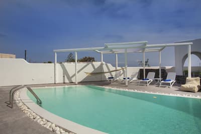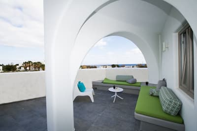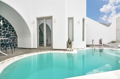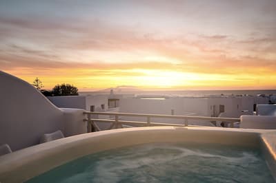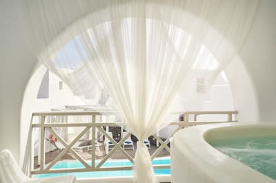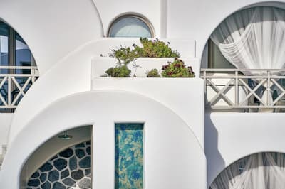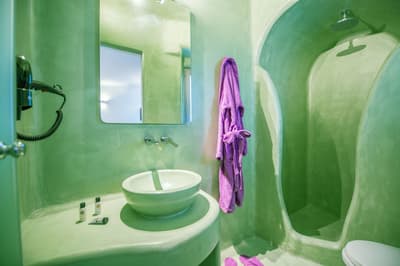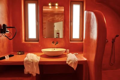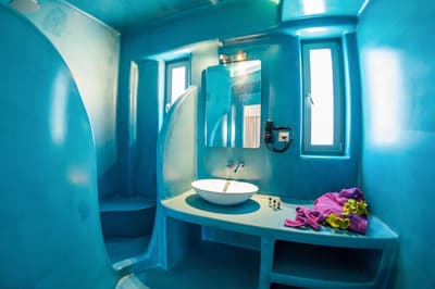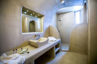Vous cherchez un hôtel iconique avec une signature écologique sur Santorin ? N’allez pas plus loin et posez vos valises au Bellezza Eco Boutique. Vous allez tomber sous le charme de ce petit hôtel intimiste qui ne comporte que 11 suites, toutes spacieuses et toutes différentes ! Et surtout, toutes équipées d’un jacuzzi ou d’une piscine privée ! Le pied ! Dégustez un bon café dès le lever sur votre terrasse avec vue sur la mer et le village, et profitez de votre chambre agréable, moderne, pensée dans un esprit minimaliste. Vous aurez aussi la surprise de découvrir une salle de bain franchement originale. On se croirait dans une grotte, comme taillée dans la roche, recouverte d’une peinture douce. Beige, grise, bleu roi ou carrément couleur cerise ! De la vasque à la douche ! Besoin d’un rafraîchissement ? Pas de panique, la piscine commune bénéficie de son petit bar pour boire un verre tranquillement en chillant à fond. Les petits-déjeuners ? Canons ! Inclus et servis dans votre chambre, qui dit mieux ? Oui, évidemment, ils se composent de produits frais et locaux ! On reste dans un hôtel écofriendly, qui a pensé tout son système de climatisation et de chauffage de manière durable et écologique. Les eaux de pluie sont récupérées pour alimenter la piscine et des panneaux solaires ont été installés. En respectant la planète, vraiment le top pour passer des vacances paisibles avec votre propre jacuzzi ou piscine.