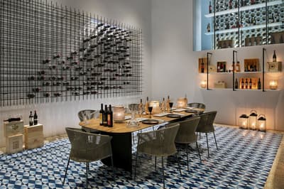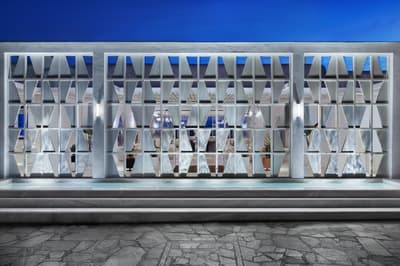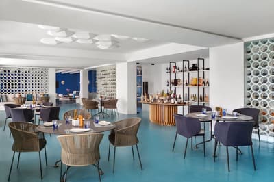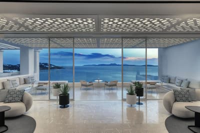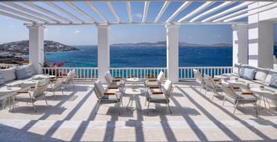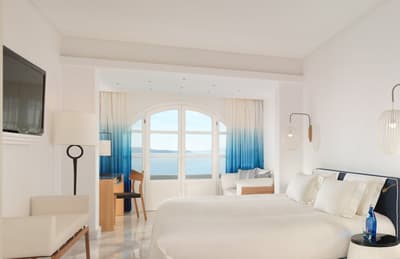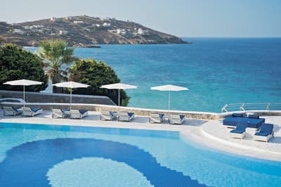 Du bleu, du blanc et du rouge qui inonde le ciel lorsque le soleil grec retourne chaque soir dans ses pénates : le Mykonos Grand Hotel & Resort pourrait être raconté en couleurs. Puis, ce sont des adjectifs qui viennent en tête lorsqu'on découvre l'établissement pour la première fois : spacieux, luxueux, calme, raffiné... Si le Mykonos Grand a élu domicile à quelques 4 kms du centre de Mykonos, il est l'un des rares hôtels à avoir les pieds dans le sable et à disposer de sa propre plage privée ! Ouvert en 2001, le resort a régulièrement fait peaux et murs neufs pour offrir un cadre bien dans son époque et des infrastructures modernes. Avec ses 112 chambres, son spa, son terrain de tennis, sa salle de fitness, ses terrasses, ses bars et ses deux restaurants, le bien nommé Mykonos Grand Hotel offre de la place et des occupations sans pour autant perdre ses clients dans des allées labyrinthiques. Côté décor, l'hôtel a misé sur la sobriété, l'élégance et la couleur locale, des chambres au parking qui aime rappeller ses origines grâce à ses colonnes grecques antiques !
