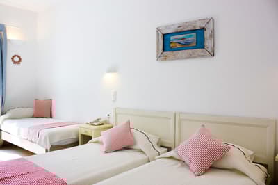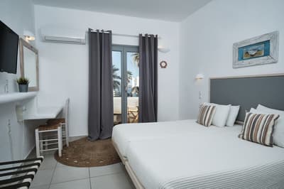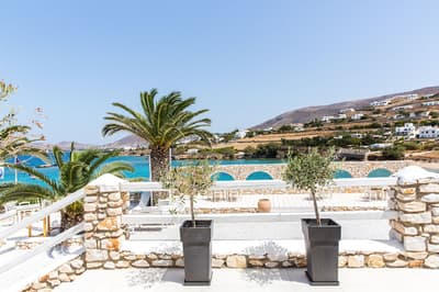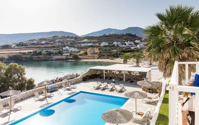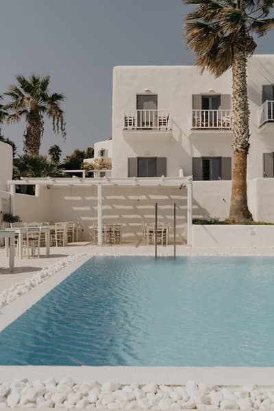 Vous avez déjà la tête comme une pastèque à force de vous demander quelle est la meilleure île de Grèce où passer vos vacances ? On a la réponse : Paros. Une planque loin des paillettes de Mykonos et de la surpopulation d'Oia, qui donne envie de prendre de la vitesse sur son scooter de loc' et de rejeter la tête en arrière, cheveux au vent. Si votre seul critère était de vous baigner dans une crique au pied de votre hôtel, optez pour le Paros Bay ! Cette adresse parfaite domine deux plages privées et s'offre le luxe d'un restaurant les pieds dans l'eau. Laissez votre valise à roulettes à la réception et installez-vous entre les coussins orangés sous la pergola, qui volent déjà la vedette à vos plus beaux couchers de soleil. On vous laisse quelques minutes pour enfiler votre maillot et courir vers la piscine, bordée de murets en pierres, de rembardes en bois blanc et de parasols en paille façon surf camp. Au loin, les volets bleus des habitations sur les collines s'imposent sur toutes vos photos format paysage et vous ne manquerez pas de dévaler le sentier vers à la plage (qui rendrait folle de jalousie Brigitte Bardot si elle n'avait pas déjà la Madrague). À l'abri des rochers polis par le sel, votre peau dorera avec modération, sous le soleil exactement. La nuit, la piscine d'eau salée rougit encore plus que vous, si vous n'avez finalement pas fait attention, et on croirait que les couleurs de l'horizon ont finalement fait le grand plongeon.