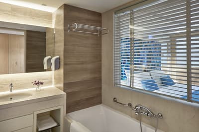 De son balcon complètement aménagé, elle profite d’une vue partielle merveilleuse sur l’océan. C’est l'idéal pour apprécier le cadre reposant et serein. Elle peut accueillir un lit double ou des lits jumeaux et dispose d’un canapé dans le coin salon. Salle de bain avec baignoire ou douche.