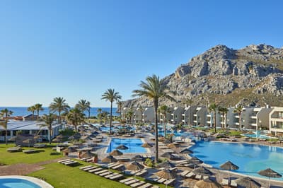 D’un côté la montagne, de l’autre la mer Egée. Rhodes enfin, mais avec un sacré choix d’hôtel. Ne venez pas dire que vous cherchiez l’intimité : avec ses 397 chambres, l'Atlantica Aegean Blue se distingue d’emblée par son gigantisme ! D’ailleurs, c’est en voiturette de golf à travers des jardins bien soignés qu’on vous conduit à votre chambre, puisque vous ne logez pas dans le bâtiment principal. Plutôt jolie, la chambre, avec ses teintes azuréennes. Spacieuse, aussi. Même si vous n'allez pas y passer beaucoup de temps : avez-vous compté toutes les piscines ? A commencer par la vôtre, peut-être, même si elle est à partager. Avouez, vous en aviez déjà vu, vous, des hôtels avec parc aquatique intégré ? De multiples toboggans, une rivière, de quoi se faire des frayeurs en s’éclaboussant et de joyeux souvenir en s’amusant ! Forcément, vous avez passé les enfants sous la toise. Car pour les glissades depuis tout là-haut, 1,20 m, c’est le minimum. Pariez qu’il ne sera pas facile de les faire sortir, même pour aller dîner ! Ce soir, pasta à la trattoria ou feuilles de vigne à la taverne grecque ? Et si vous êtes bien sages, bien sûr que vous pourrez venir au spectacle, et même déguster une glace.