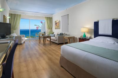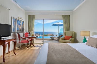 De son balcon aménagé de belles chaises, elle profite d’une vue époustouflante sur l’océan. Spacieuse et très confortable pour sa catégorie, elle est vraiment agréable. Elle baigne dans une atmosphère reposante. Petit coin salon avec un canapé-lit. Salle de bain chic avec baignoire d’hydromassage.