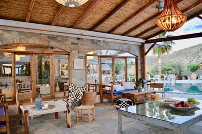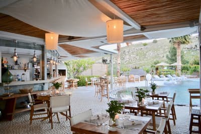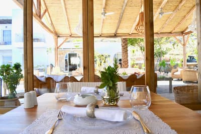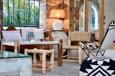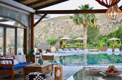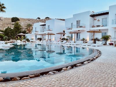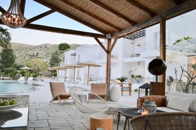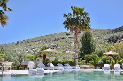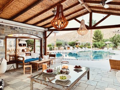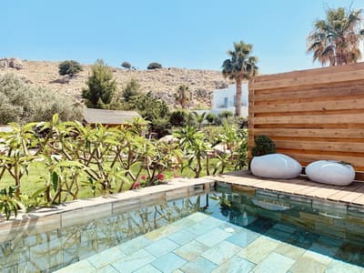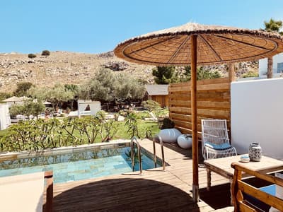 Envie d’une parenthèse chic à l’abri du monde extérieur ? Le Caesars Palace pourrait devenir votre prochain coup de cœur ! A 1 km de Lindos, ce Boutique Hotel au charme écolo raffiné est discrètement niché dans un océan de verdure. Au milieu de jardins luxuriants, vous apercevez les bâtiments à l’architecture typique. Les petites maisons aux murs blanchis à la chaux se détachent sur fond de collines escarpées. On vous accueille comme un ami et on vous fait faire le tour de la propriété. Difficile de ne pas poser sa serviette du côté de la piscine extérieure ! Des chaises longues aux coussins rembourrés et une terrasse en galets entourent une eau joliment colorée par un sol en mosaïque. Quelques notes de musique soft aident à se relaxer. En contrebas, l’espace jacuzzi est encore plus user-friendly : lits à baldaquins, daybeds posés sur l’herbe et profusion de coussins. Il y a une cabane spa pour massages en plein air et soins de beauté dans le jardin parfumé. Une petite faim ? Pas besoin de vous rhabiller. Le pool house accueille bar et restaurant dans un décor rustique hyper stylé : meubles en bois traditionnels, lampes design, tables confortables et miroirs aux cadres sculptés. Si le lieu est régal pour les yeux, la gastronomie n’est pas en reste. Les saveurs méditerranéennes proviennent directement du jardin bio de l’hôtel. Il ne vous reste plus qu’à savourer sans risque d’être importuné : l’établissement est adults only !