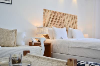 D’une simplicité exquise, elle est parfaite pour se couper du quotidien. Elle mélange bois, rotin et verre pour une décoration exotique et légère. Elle est vraiment cosy. De beaux tableaux parsèment la pièce la rendant vivante. Peinte de blanc, elle est très design.