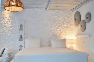 Installée au rez-de-chaussée, elle est entourée par une végétation luxuriante. Elle baigne dans une atmosphère légère et sereine. Elle accommode un lit double ou des lits simples. Le coin salon est meublé de fauteuils confortables et originaux pour un moment de détente. Salle de bain chic avec douche.