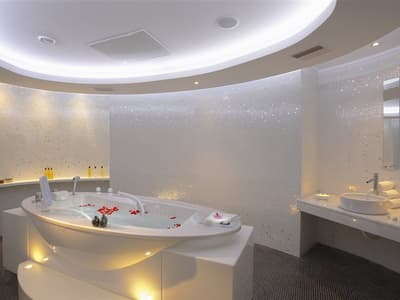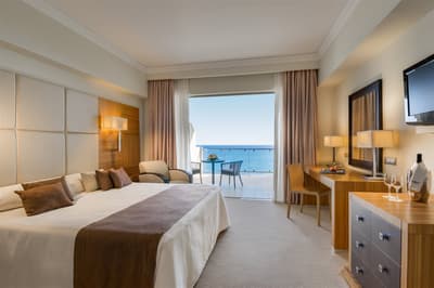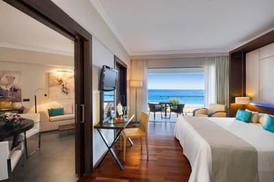 Cette belle suite profite d’un cadre merveilleux. Le grand balcon est aménagé de belles chaises pour apprécier la vue panoramique sur la mer d’Égée. C’est un cadre idyllique. Son salon dispose de canapés-lits offrant plus d’intimité et de confort. Salle de bain chic avec baignoire d’hydromassage.
