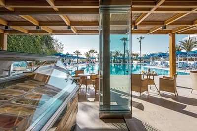 Beaucoup moins tape à l’œil que ses voisins, le Mitsis Faliraki Beach Hotel & Spa n’en reste pas moins un bel établissement all inclusive idéalement situé sur la côte est de l’île de Rhodes, le long d’une immense plage de sable et de galets. L’avantage ici, c’est qu’il y a plus de sable que de galets, et que la pente est si douce que les enfants peuvent patauger en toute tranquillité, et ça c’est vraiment cool. Parce qu’il faut le savoir, vous êtes dans un hôtel familial, donc des enfants, il peut y en avoir beaucoup, mais il y a tellement d’activités pour eux dans l’hôtel que vous les remarquerez à peine. Et puis vous aussi serez forcément occupés, entre les cours de yoga ou d’aquagym, les tournois de ping pong ou de tennis, les matchs de water polo ou de beach volley, ou les apéros entre copains. Et comme ce ne sont pas les bars qui manquent, vous allez vous en faire plein des nouveaux potes, et vous pourrez même en profiter pour réviser vos langues étrangères si vous avez tout oublié depuis vos années lycée ; de quoi s’offrir deux voyages pour le prix d’un !