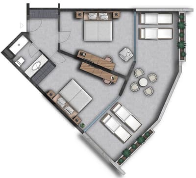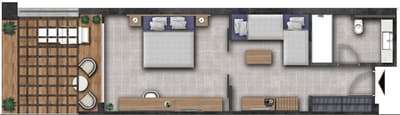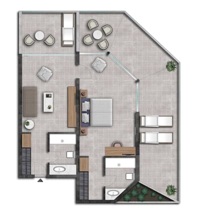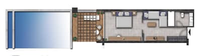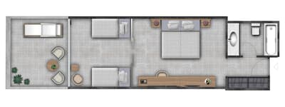 Idéale pour les familles, elle offre encore plus d’espace et de confort. Elle dispose de 2 chambres pour plus d’intimité. Installée à l’étage, elle profite d’une vue panoramique merveilleuse sur l’océan. Le balcon est meublé de belles chaises pour apprécier le cadre. Salle de bain chic.