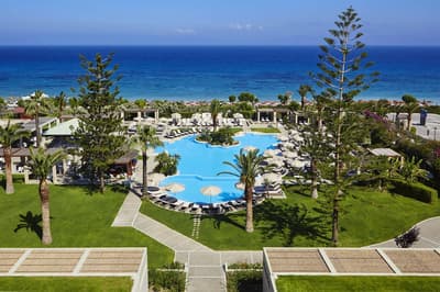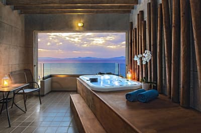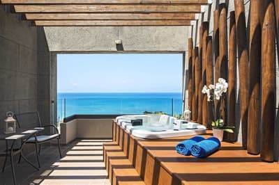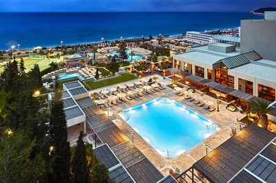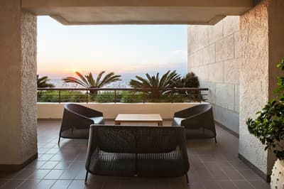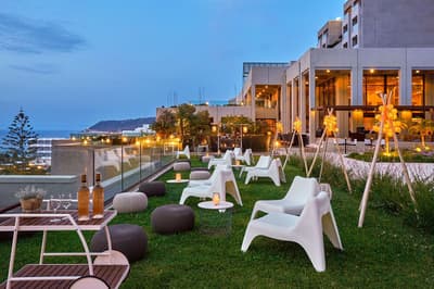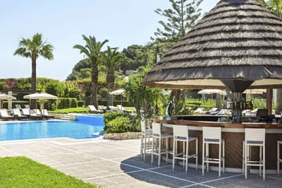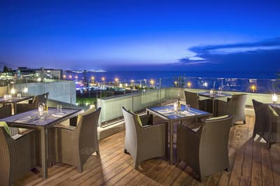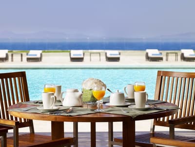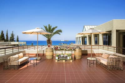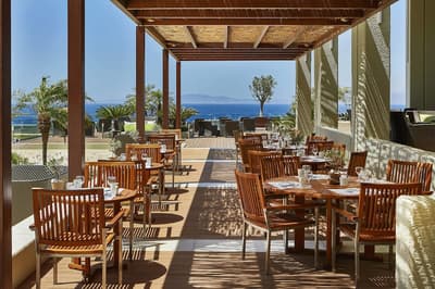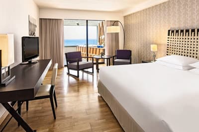 D'accord, les bâtiments du Sheraton n’ont pas ce petit je-ne-sais-quoi de charmant. D’accord, c'est massif. En revanche, sympa l’environnement, adossé à la montagne, et l’immensité de la mer Egée pour horizon ! Allez, entrez vite pour corriger vos premières impressions : le lobby, par exemple, avec ses baies vitrées monumentales, vous nargue déjà de sa vue. Deux ascenseurs plus tard, 12e étage... Certes, votre chambre a ce côté un peu aseptisé, mais les teintes choisies répondent avec douceur aux couleurs de la mer, du ciel et du sable. Mais oui, vous avez un balcon ! En contrebas, une des piscines, mais déjà, votre regard se perd sur la plage privée. Un peu venteuse, idéale pour ne pas être en surchauffe l’été ! Pour éviter de traverser la route, empruntez le tunnel, creusé tout exprès. Et si vous prenez l’option chambre et petit déjeuner, vous pourrez alterner les différentes spécialités. Franchement charmant, le resto méditerranéen, avec ses chaises de bois et de paille et ses nappes à carreaux bleus. Des tomates juteuses et de la vraie féta, direction Théa, le resto grec, qui s’épanouit entre des oliviers sur la terrasse du 6e étage. Pourquoi ne pas goûter le galaktoboúreko ? On vous laisse la surprise de ce délicieux gâteau !