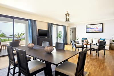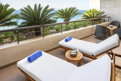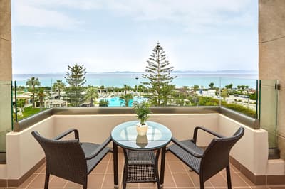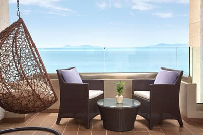 Elle profite d’une vue merveilleuse sur la mer. Son balcon est aménagé de belles chaises pour apprécier le cadre serein et propice à la détente. Elle dispose de lits jumeaux et d’un petit coin salon meublé de fauteuils confortables. Salle de bain chic.