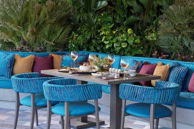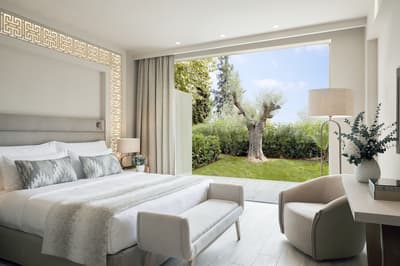 Cette belle suite se prolonge vers l’extérieur pour un espace ouvert et serein. Son petit jardin privé est aménagé de longues chaises pour apprécier la vue sur les jardins ou sur l’océan. Coin salon meublé d’un canapé-lit. Salle de bain chic avec baignoire et douche à effet de pluie.