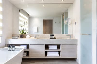 Très spacieuse, elle offre encore plus de confort. De son grand balcon, elle profite d’une vue époustouflante sur la marina ou sur les piscines du complexe. C’est un espace ouvert et serein. Le salon est meublé d’un canapé-lit et de fauteuils pour apprécier le cadre merveilleux. Salle de bain chic avec baignoire et douche à effet de pluie.