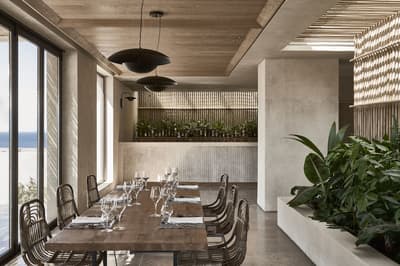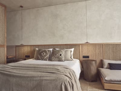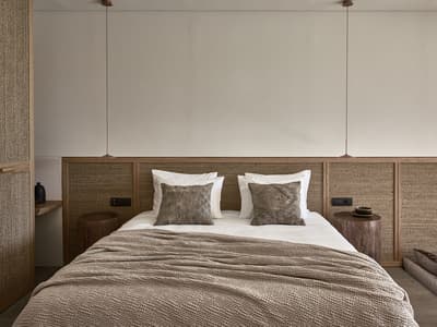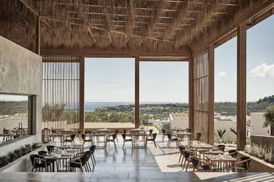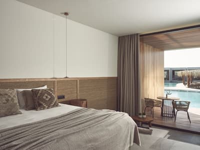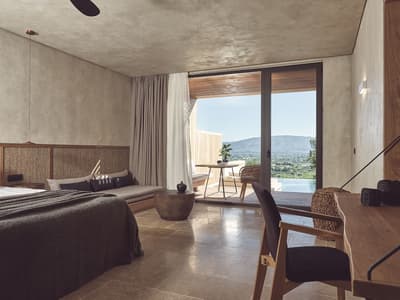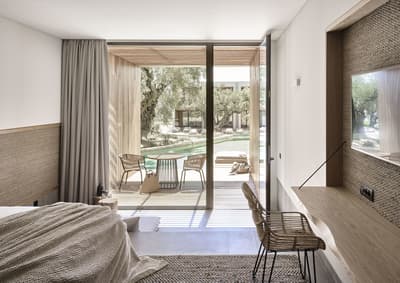 Posté là, sur les hauteurs de la côte nord-est de l’ile de Zakynthos, l’Olea all Suite Hotel domine fièrement. Il faut dire que depuis son ouverture, il y a quelques années seulement, le lieu a fait parler de lui. Grâce à son architecture radicale-tropicale, il montre une personnalité vraiment peu commune... Dans sa chemise de béton parfaitement assumée, l’Olea all Suite Hotel s’est construit autour d’une piscine-lagon qui offre une scène très nature, entre les oliviers et une flore indigène centenaire. Et grâce à une déco exotico-chic, l’immersion est instantanée : de quoi vous projeter en quelques secondes dans un hémisphère sud délicieusement lointain ! Dotée de 93 villas, l’adresse donne l'impression d'être au mileu d'un village rural hyper gracieux : dans tous ses espaces, on ressent une connexion parfaite avec le monde extérieur. L'usage fait des matériaux naturels ainsi que la déco dépouillée, qui mêle produits artisanaux et éléments modernes, contribuent d'ailleurs à faire de l’Olea All Suite une adresse vraiment à part. Un « à part » que vous vivrez en une version farniente et bien-être, les yeux rivés sur cette ligne d’horizon toute bleue, accessible 24/7, de toutes parts. A votre azur !