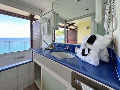 Le top ! Installée face à la mer, elle profite d’une vue superbe et du bruit des vagues. La terrasse est aménagée de transats. Très spacieuse, elle accommode un grand lit king ou des lits jumeaux et dispose d’un lit supplémentaire dans le coin salon. Salle de bain vitrée avec vue.