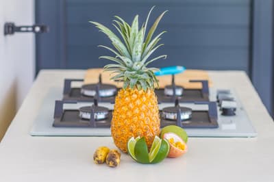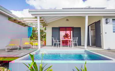 En 2022, les cases créoles ont bien changé ! A l'Iguane House Villas & Micro Spa, c'est un architecte qui s'est chargé de les relooker. C'est ultra design et c'est superbe ! Bien évidemment, on retrouve les codes traditionnels locaux avec la terrasse couverte, la charpente, l'utilisation de lambris peints et des couleurs vives. La terrasse a été imaginée tel l'auvent d'un lodge, soutenu par deux piquets. Original ! La cuisine est ouverte sur l'extérieur pour faciliter le service. Le confort est simple mais tout y est. La petite piscine et le jardinet seront enfin les divins complices de ce concentré d'exotisme. Le plus, ce sont tous ces services disponibles en plus de ce concept locatif, qui sont autant d'attentions pour pimenter - au sens propre comme au figuré ! - et immortaliser votre séjour. On en oublierait presque le cadre ! Impossible ! Perché sur la falaise du flibustier, avec vue mer sur Marie-Galante, le lieu offre une perspective inspirante, en particulier depuis la terrasse de la villa Passion. Vivre de passion et d'eau fraîche, ça vous dit ?
