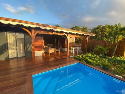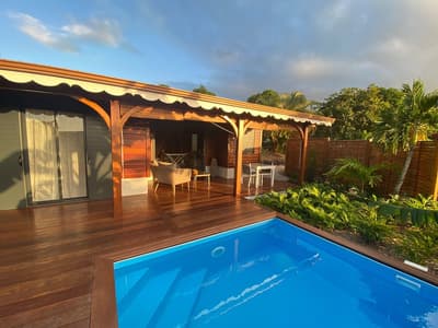 Elle profite d’une piscine privée pour nager de jour comme de nuit et est située dans un cadre reposant. À noter qu’elle comprend une cuisine contemporaine toute équipée. Après vos activités, vous pourrez vous détendre sur la grande terrasse en bois exotique avec salon de jardin et transats.