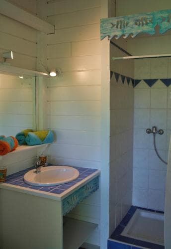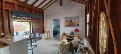 Conçue en bois exotique, elle arbore un beau carrelage, un mobilier en bois et se complète par des accessoires artisanaux. La chambre climatisée est dotée d’un lit queen size avec moustiquaire et la salle de bains en marbre est équipée d’une douche à l’italienne. La maison est conçue pour personne à mobilité réduite ( PMR) accompagnée. Le tout dans une atmosphère tropicale !