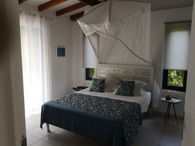 Tout juste rénovée, elle arbore un beau carrelage, un mobilier en bois et se complète dans une dominance de blanc. La chambre est dotée d’un lit queen size de 160 x 200 avec moustiquaire et la salle de bains est bien équipée. Le tout dans une atmosphère tropicale !
