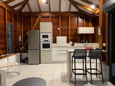 Idéale pour un séjour en amoureux, elle profite d’une cuisine contemporaine équipée de tout le nécessaire. Après vos activités de la journée, vous pourrez vous détendre sur la grande terrasse en bois exotique avec salon de jardin et transats et contempler la vue imprenable sur le jardin aux arbres et fleurs tropicales. À noter qu’elle comprend une piscine privée pour nager de jour comme de nuit.