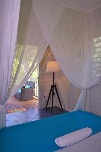 Des mini villas qui semblent avoir poussé au cœur d’une forêt tropical : voilà le spectacle de rêve qu’offre le domaine Tiparéo. Les 5 logements indépendants sont à louer dans un esprit gîte. Piscine privée sur la terrasse ou cuisine, vous êtes chez vous dans ces petites maisons créoles en bois exotiques ! Elles sont spacieuses (minimum 50 m²) et totalement ouvertes sur la nature environnante, pour une déconnexion totale. Côté déco, on se situe entre l’esprit traditionnel caraïbéen et le mobilier simple et coloré d’un jeune couple. Autant dire qu’on se sent vite à l’aise ! Le Tiparéo est une véritable oasis de paix où seul le chant des oiseaux exotiques vient troubler vos moments de détente. Même si le parc incite à la flânerie : ce serait dommage de ne pas profiter de sa situation au nord de Basse-Terre, le coin le plus authentique de Guadeloupe, pour découvrir Grande Anse, l’une des plus belles plages de l’île, digne de la série Lost ! A moins de se lancer dans une excursion en mer dans le Grand Cul de Sac Marin, dont la beauté et la biodiversité sont mondialement reconnues. Pas de restauration ici, ni vraiment d’animations, mais on peut compter sur la dévotion du couple de propriétaires, amoureux de leur île. Ils partageront leurs excellents conseils en vous apportant quelques fruits du jardin à déguster. Très soucieux de l’environnement, leurs écolodges sont parmi les plus vertueux de l’île. Panneaux solaires, récupération d’eau de pluie, limitation de la bétonisation et compostage, ils ont aussi pensé aux personnes à mobilité réduite. Ils sont les seuls en Guadeloupe à avoir installé des équipements adaptés pour leur permettre de profiter de la piscine et du logement sans limitations. Un effort d’inclusivité qu’il faut applaudir !